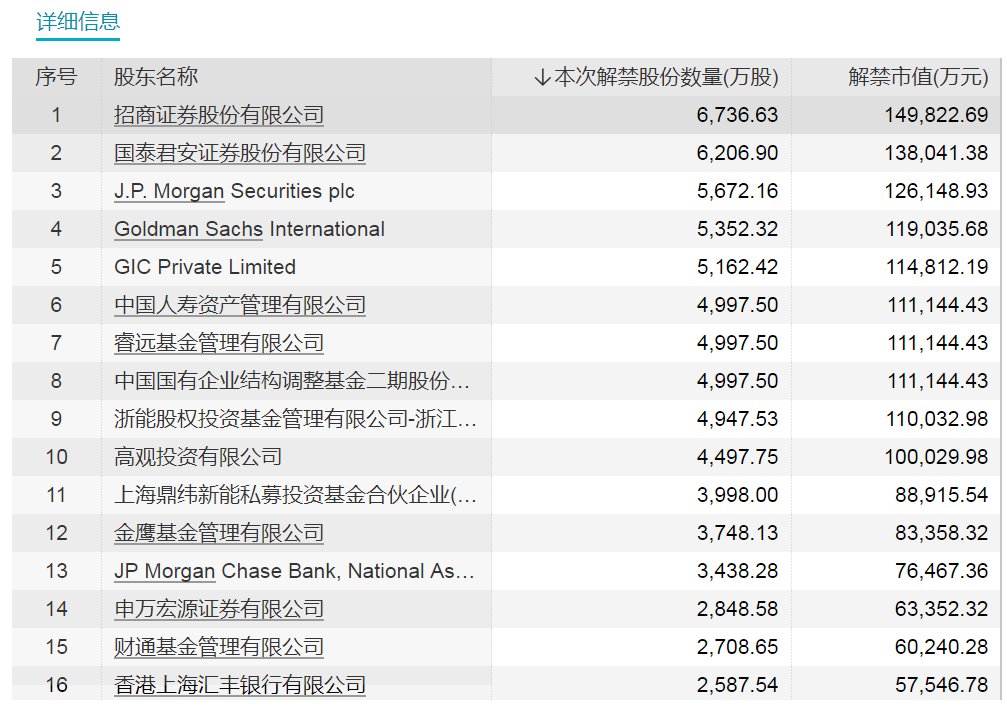 解禁市值第二大的长江电力,解禁股东为招商证券股份有限公司、国泰君安证券股份有限公司、J.P. Morgan Securities plc等19个股东,这些股东下周解禁的股份来自于长江电力今年2月完成的定增,彼时的定增发行价为17.46元/股。