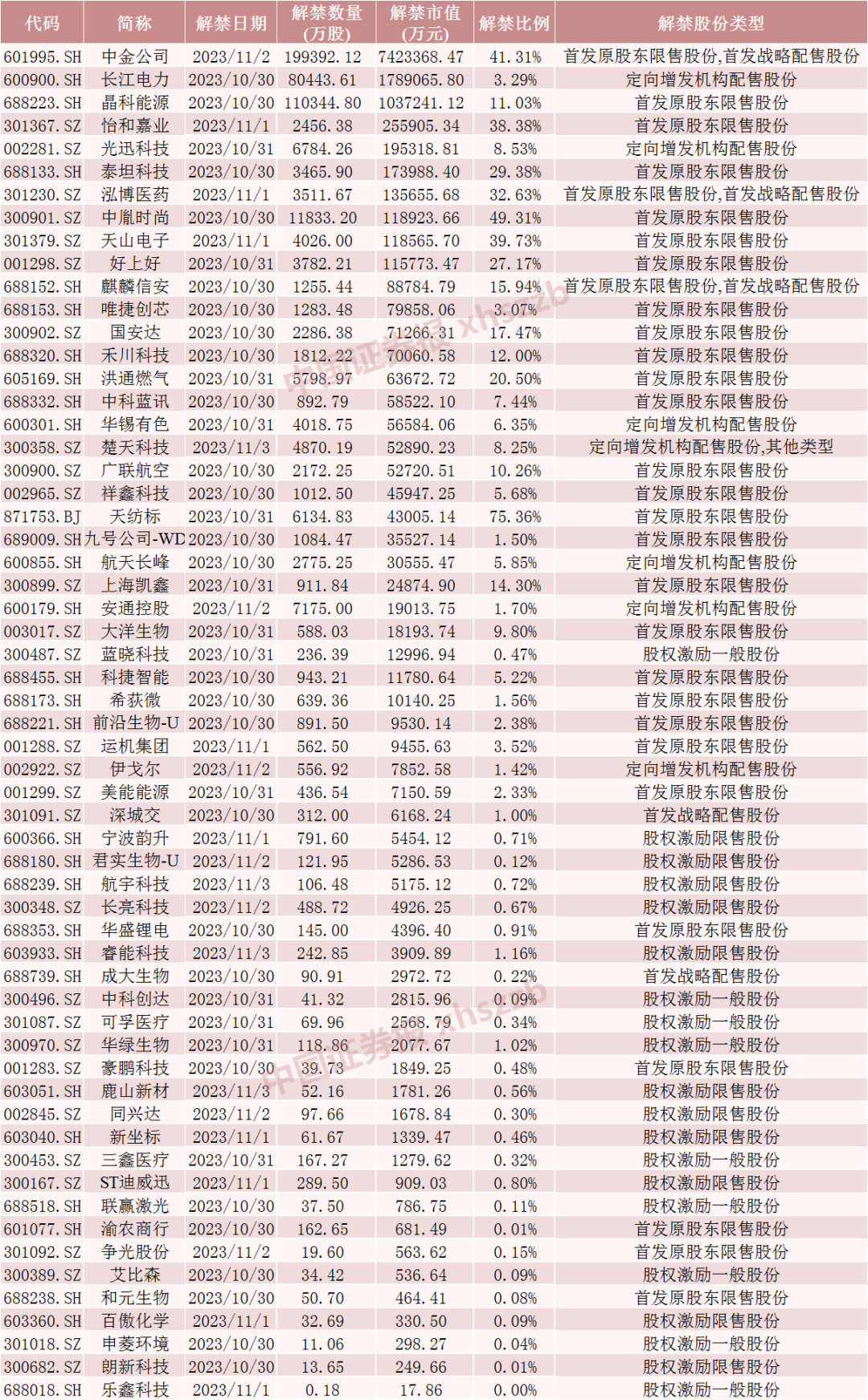 其中,中金公司11月2日将解禁19.94亿股,为首发原股东限售股份和首发战略配售股份;长江电力10月30日将解禁8.04亿股,均为定向增发机构配售股份;晶科能源10月30日将解禁11.03亿股,均为首发原股东限售股份。