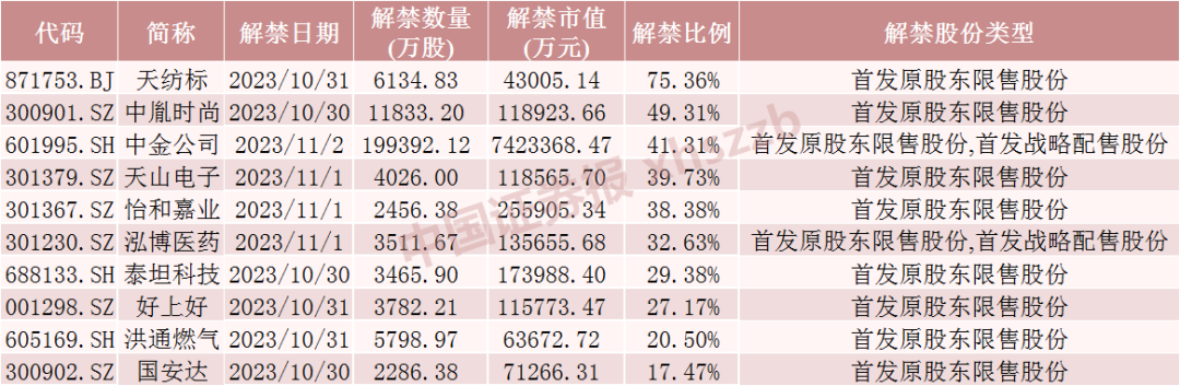 其中,中金公司、长江电力、晶科能源将解禁金额超100亿元,天纺标、中金公司、天山电子、怡和嘉业、泓博医药、好上好流通盘将增加超100%。