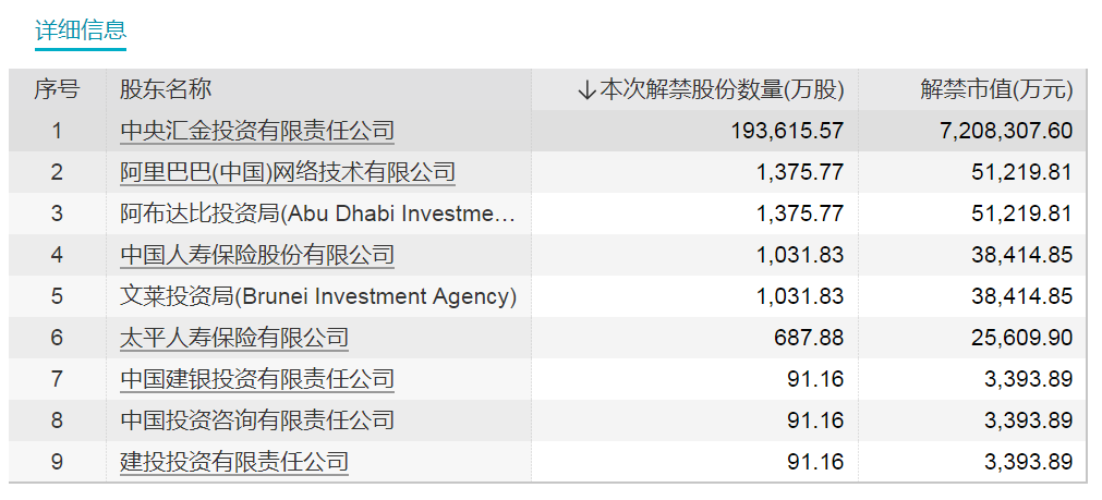 解禁市值最大的中金公司,解禁股东为中央汇金投资有限责任公司、阿里巴巴(中国)网络技术有限公司、阿布达比投资局等9个股东,中央汇金投资有限责任公司为中金公司第一大股东。