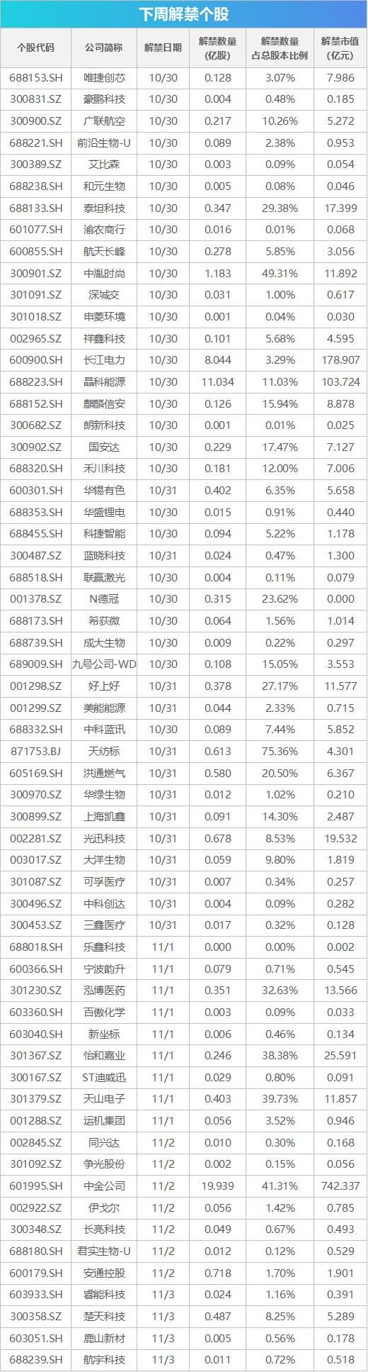 从解禁市值来看,11月2日是解禁高峰期,7家公司解禁市值合计746.27亿元,占下周解禁规模的60.6%。按10月27日收盘价计算,解禁市值居前三位的是:中金公司(742.34亿元)、长江电力(178.91亿元)、晶科能源(103.72亿元)。从个股的解禁量看,解禁股数居前三位的是:中金公司(19.94亿股)、晶科能源(11.03亿股)、长江电力(8.04亿股)。
