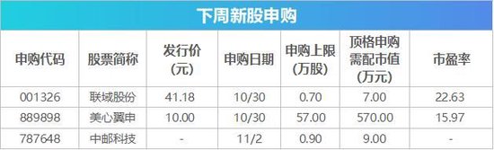下周,A股将有3只新股网上发行。其中10月30日发行的是联域股份、美心翼申;11月2日发行的是中邮科技。
