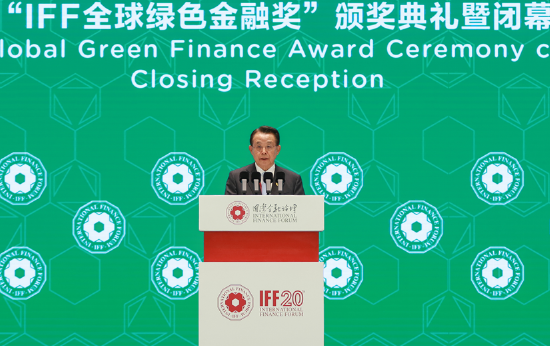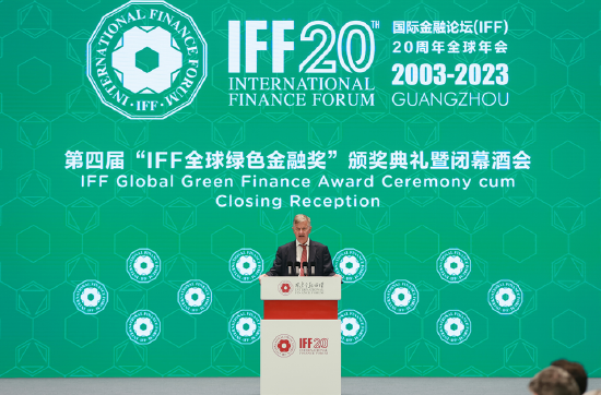 (29日晚,IFF 副主席、联合国前副秘书长兼联合国环境规划署前执行主任埃里克·索尔海姆在第四届“IFF全球绿色金融奖”上发表颁奖致辞)