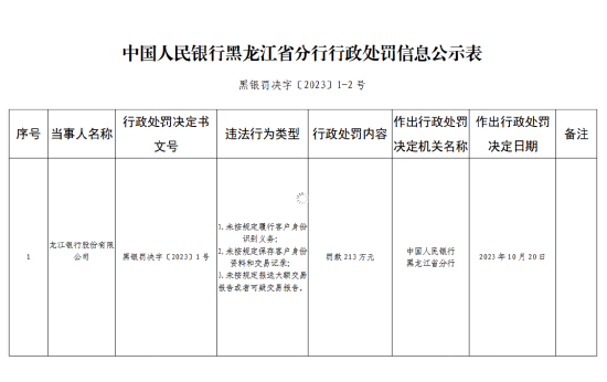 10月30日金融一线消息,中国人民银行黑龙江省分行网站日前公布行政处罚信息公示表(黑银罚决字〔2023〕1-2号),龙江银行股份有限公司存在以下违法行为:1.未按规定履行客户身份识别义务;2.未按规定保存客户身份资料和交易记录;3.未按规定报送大额交易报告或者可疑交易报告。