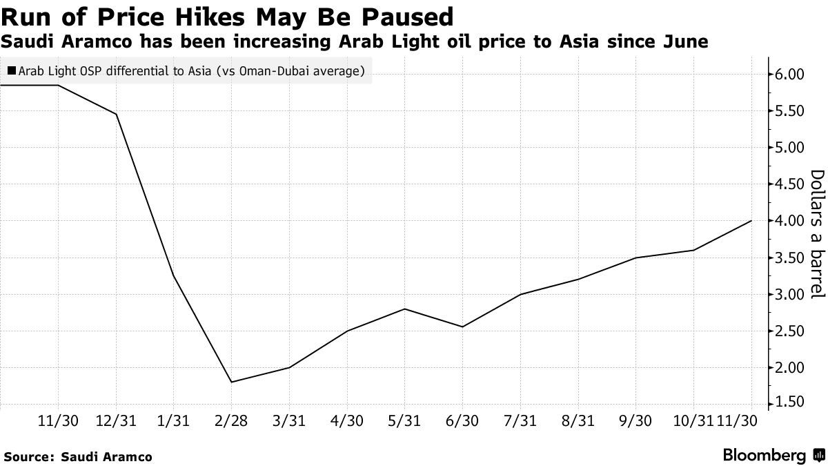 由于亚洲地区炼油利润率下降削弱了对现货原油的需求,沙特可能会在6个月来首次暂停提高面向亚洲客户的原油官方售价。据媒体对7家交易商和炼油商的调查,普遍预计沙特阿美将维持12月份销往亚洲的旗舰阿拉伯轻质原油的价格与11月一致。而自6月以来,由于需求保持健康且库存减少,沙特已经连续上调了销往亚洲的原油官方售价。