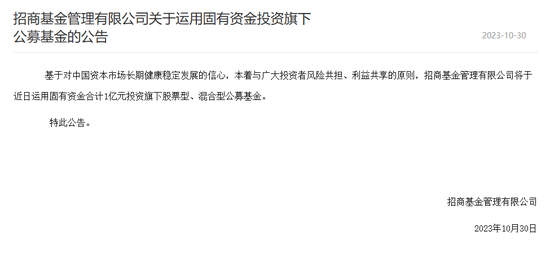 10月30日,招商基金公告称,基于对中国资本市场长期健康稳定发展的信心,本着与广大投资者风险共担、利益共享的原则,公司将于近日运用固有资金合计1亿元投资旗下股票型、混合型公募基金。
