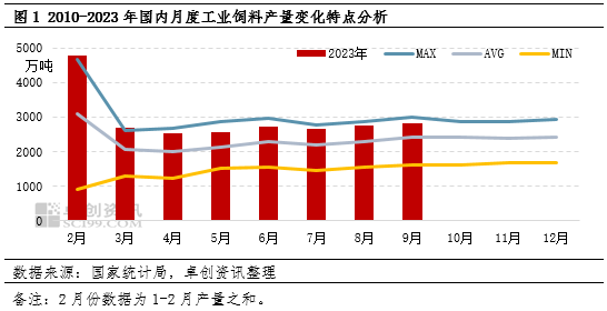 国家统计局最新数据显示,9月份国内饲料产量为2836.2万吨,环比增长3.1%,同比减少5.35%。从图1中可看出,今年7-9月国内饲料产量缓慢增长,三季度总产量为8249.2万吨,较二季度增幅5.57%,较去年同期减少0.61%;7-9月产量与近年同期的最高均值比较接近,说明国内饲料消费比较旺盛。
