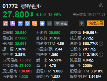 锂业板块大跌,龙头赣锋锂业跌近113%。消息面上,赣锋锂业披露三季报,第三季度实现归母净利润1.6亿元,同比下降97.88%。以公司Q2实现归母净利润34.54亿元计算,Q3归母净利润环比下降95%。 三季报显示,赣锋锂业对联营企业和合营企业的投资收益约7亿元,而在Q2,该数值为17.6亿元,两者相差超过10亿元。