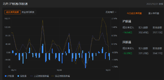 10月31日消息,北向资金全天净卖出47.53亿元,其中沪股通净卖出14.64亿元,深股通净卖出32.89亿元。北向资金10月累计净卖出近447.86亿元,2015年以来首次连续3月减仓。北向资金9月减仓A股374.6亿元,8月减仓A股896.82亿元。