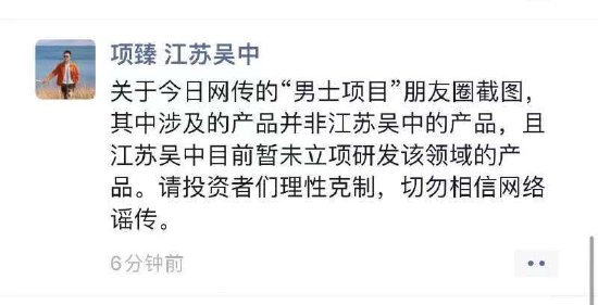 此高管称:“关于今日网传的“男士项目”朋友圈截图其中涉及的产品并非江苏吴中的产品,且江苏吴中目前暂未立项研发该领域的产品。请投资者们理性克制,切勿相信网络谣传。”