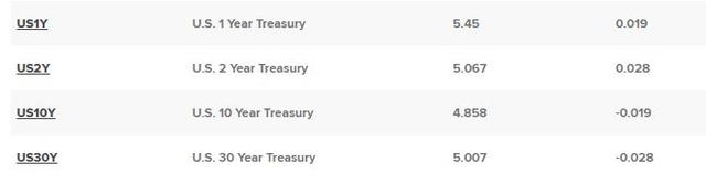 在周三美联储公布货币决策的前夕,美债收益率走势分化,短债收益率小幅走高,长债收益率小幅走低,曾引发风险资产异动的10年期基债收益率继续远离5%关口。