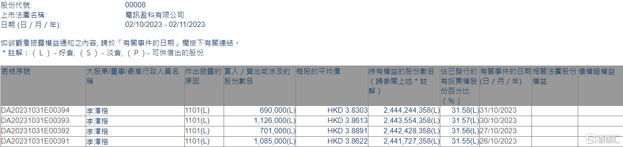 格隆汇11月2日丨根据联交所最新权益披露资料显示,2023年10月26日-10月31日,电讯盈科(00008.HK)获执行董事李泽楷(主席)在场内以每股均价3.8303-3.8891港元合计增持360.2万股,涉资约1390.75万港元。