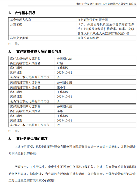 据悉,因工作调整,严颖女士、王小平先生、李康先生自10月31日起不再担任湘财证券副总裁职务,离职后未转任湘财证券其他工作岗位。相关人事变动已由湘财证券第四届董事会第一次会议审议通过,并将按规定向相关监管机构备案。