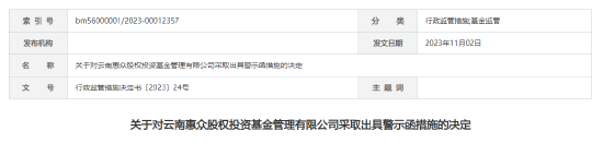 近日,云南证监局披露了《关于对云南惠众股权投资基金管理有限公司采取出具警示函措施的决定》的公告。