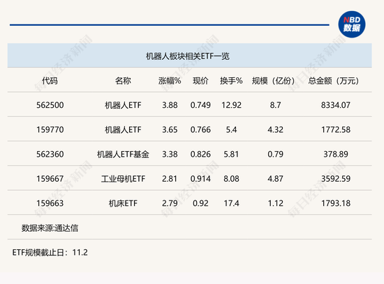 点评:受利好刺激影响,机器人个股今日表现突出,机器人ETF(562500)、机器人ETF(159770)以及机器人ETF基金(562360)涨幅均超过3%,他们均追踪的是中证机器人指数。其中,机器人ETF(562500)涨幅最大,达到3.88%,成交金额也有8334万元,是资金偏好程度最高的机器人类ETF产品。另外,该ETF规模较大,达到8.7亿份。