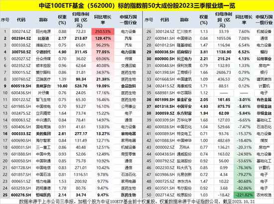 根据中证指数公司数据,中证100指数前50大权重股仓位占比达78.54%。从前50大成份股整体业绩表现来看,按整体法统计,除中芯国际外的49家龙头公司前三季归属母公司净利润合计达12869.95亿元,同比增长5.2%。