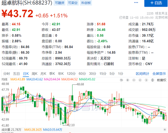 业绩方面,2023年前三季度,超卓航科营业收入1.79亿元,同比增66.79%,归属于上市公司股东的净利润0.35亿元,同比降28.76%。