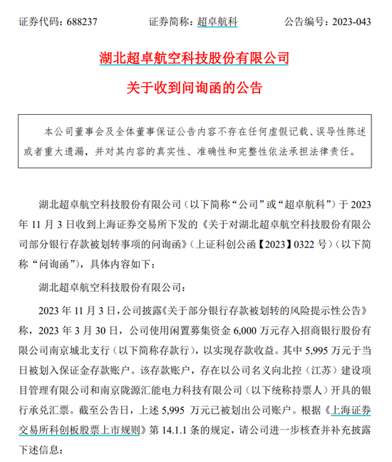 11月3日晚,上交所就上述事项火速向超卓航科发出问询函。问询函要求公司进一步核查并补充披露五方面信息: