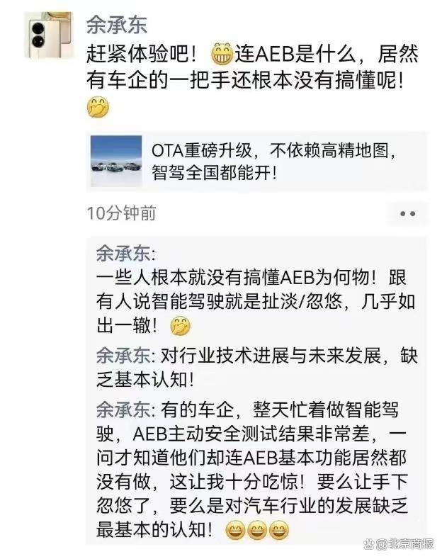 11月3日晚间,华为常务董事、终端BG CEO、智能汽车解决方案BU董事长余承东在朋友圈针对AEB技术(Autonomous Emergency Braking,自动紧急制动系统技术)发文称,“连AEB是什么,居然有车企的一把手还根本没有搞懂;一些人根本就没有搞懂AEB为何物!跟有人说智能驾驶就是忽悠,几乎如出一辙!”