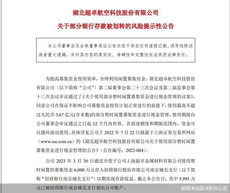 超卓航科11月3日晚间披露的公告显示,公司2023年3月30日通过全资子公司上海超卓金属材料有限公司使用暂时闲置的募集资金6000万元存入招商银行股份有限公司南京城北支行(以下简称“招商银行南京城北支行”)以期实现存款收益。但截至公告日,其中5995万元已被招商银行南京城北支行划出公司账户。