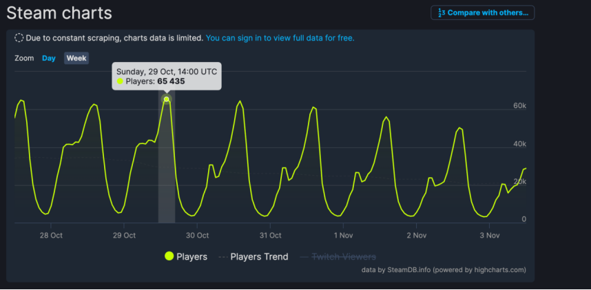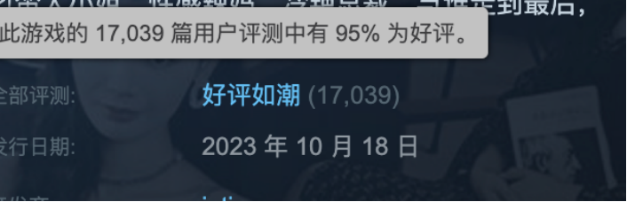 该游戏于10月18日上线,力压《永劫无间》《使命召唤》,连续多日成为Steam国区热销榜榜首,以95%的好评率被Steam评级为“好评如潮”,过去一周在线玩家峰值最高达6.5万。
