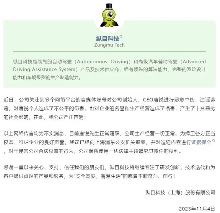 此前终止IPO的智能驾驶公司纵目科技11月4日发布声明回应网络传言。声明称,目前公司创始人、CEO唐锐正常履职,公司生产经营一切正常。
