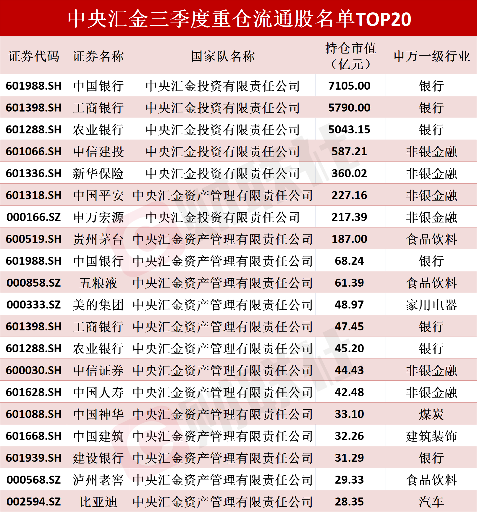 从行业分布来看,中央汇金三季度前十大重仓流通股较为集中的分布在银行、非银金融、食品饮料领域。