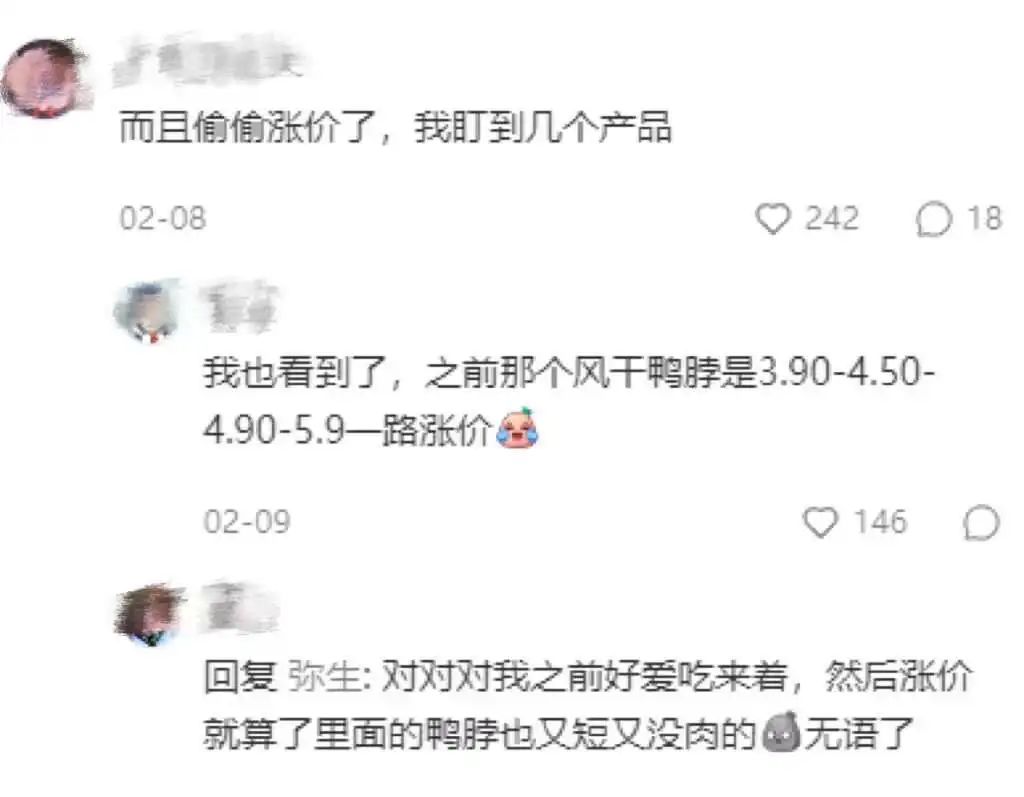 一边是克数减少,一边是偷偷涨价,每次几毛虽然变化不大,但苍蝇腿也是肉,时间久了发现自己被割得润物细无声。“眼睁睁地看着风干鸭脖从3.9元涨到5.9元,3.9、4.5、4.9、5.9,越来越贵。”
