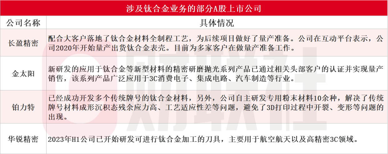 据不完全统计,涉及钛合金业务的A股上市公司主要有长盈精密、金太阳、铂力特、华锐精密等,具体情况如下: