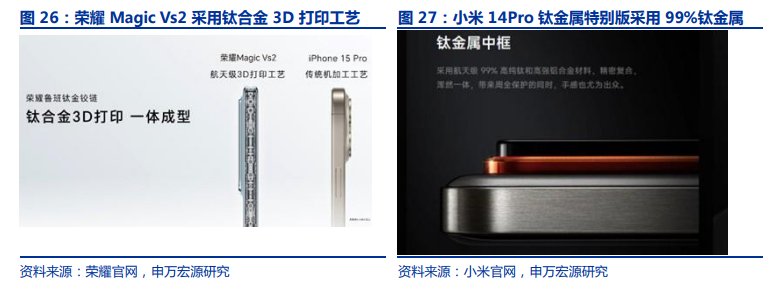 财联社11月5日讯(编辑 平方)近期多款热门智能手机产品均有钛合金材料应用。上周,小米14 Pro推出钛金属特别版,采用99%钛金属中框。荣耀于10月12日发布轻薄大内折旗舰手机荣耀Magic Vs2,采用鲁班钛金铰链等创新材料。早前,苹果发布iPhone 15,其中Pro版本采用全新钛金属机身,成为苹果首款在采用航空级钛金属的手机。
