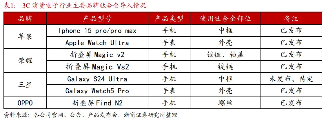市场分析人士认为,钛合金具备显著性能优势,有望成为消费电子材料创新趋势,目前荣耀、苹果、三星等主流3C厂商均开始不同程度导入。浙商证券分析师王华君10月13日研报指出,未来如进一步在各类3C消费电子品牌及产品类型(手机—手表—Pad—笔记本电脑)中逐步渗透,成长空间有望持续打开。
