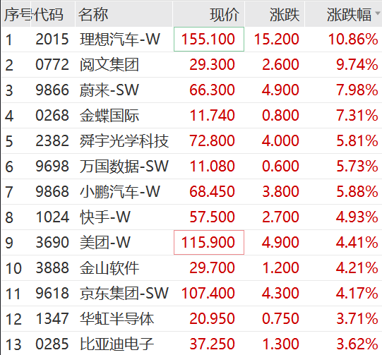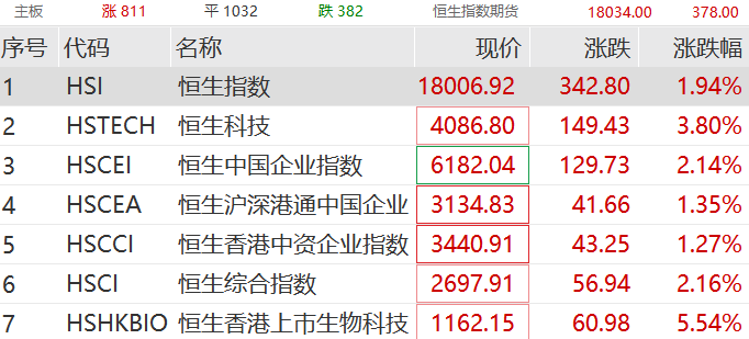 港股早间高开:恒指涨1.41%,恒生国企涨1.62%,恒生科技大涨2.25%。开盘后持续走高,恒指盘中收复18000点,恒生科技一度涨近4%。上午新能源车领涨恒生科技,理想汽车大涨近11%,蔚来、小鹏涨幅居前。