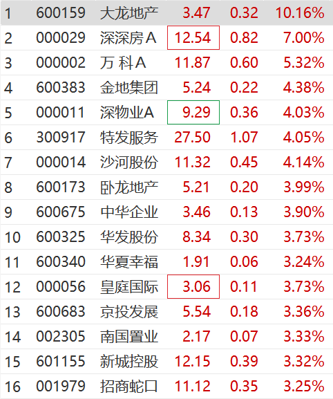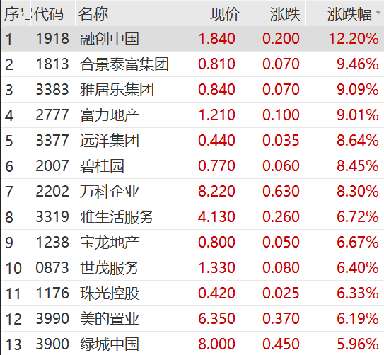 港股市场上内房股同样走高,融创中国涨超12%,富力地产、远洋集团、碧桂园等集体大涨。