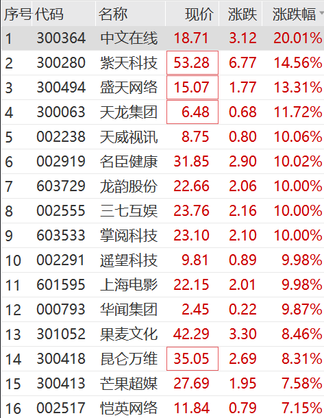 个股方面,中文在线强势走出20CM涨停,天威视讯、龙韵股份三连板,名臣健康、掌阅科技、上海电影、华闻集团等多股涨停;紫天科技(维权)、盛天网络、天龙集团涨超10%。