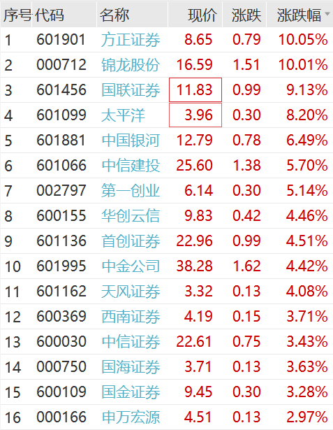 11月6日上午,与市场预期一致,券商股开盘走高,券商指数涨幅一度达到3.71%。方正证券、锦龙股份接连涨停,国联证券、太平洋涨冲击涨停线。大市值个股中,千亿市值的中国银河、中信建投涨超6%,中金公司、中信证券、申万宏源等均有明显涨幅。