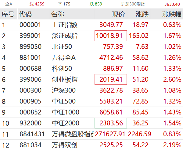11月6日上午,A股主要指数开盘全线飘红:上证指数涨0.54%报3047.13点;深证成指涨0.7%,创业板指涨0.82%。上午市场高开高走,创业板指涨超2%,截至发稿市场超4200只个股飘红。
