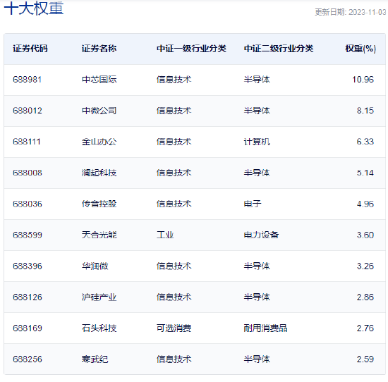 截至2023年11月3日,该指数前十大权重股包括中芯国际、中微公司、金山办公、澜起科技、传音控股等,前十大权重股占比合计约为50.59%。