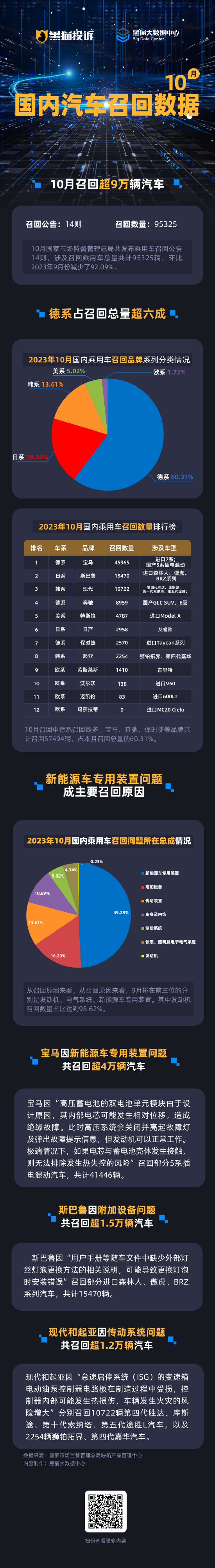 黑猫大数据中心根据国家市场监督管理总局于2023年10月份发布的国内乘用车召回公告相关数据,带消费者整体回顾10月份汽车召回情况。