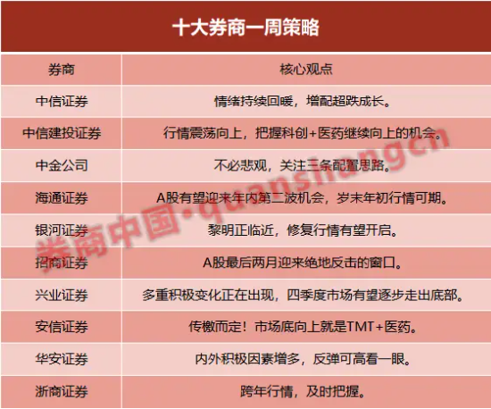 从券商最新一周策略来看,普遍认为对于后续市场表现不必悲观,市场有望呈现震荡向上趋势。招商证券最新策略直言“A股最后两月或迎来绝地反击的窗口”。