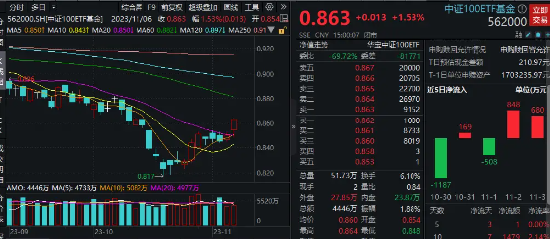 近日来A股震荡向上,周一(11月6日)市场成交额时隔4个交易日后重回万亿元上方,北向资金大幅扫货超50亿元,连续3日增仓。A股核心宽基中证100ETF基金(562000)亦呈现震荡走高趋势。