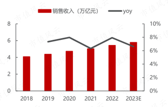 根据中商产业研究院数据,我国输配电及控制设备行业的总市场规模2018年为4.09万亿,2022年增长至5.44万亿,预计2023年将达到5.80万亿。