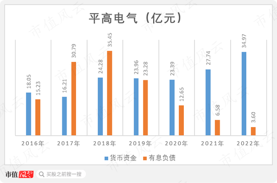 2016-2022年,平高电气账上货币资金有所增加,2022年为34.97亿。