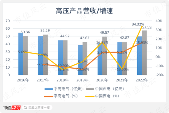 具体来讲,2016-2019年,两家企业高压产品收入放缓或出现负增长,2020-2022年,两家公司营收都是增长态势,且2022年增幅较大。