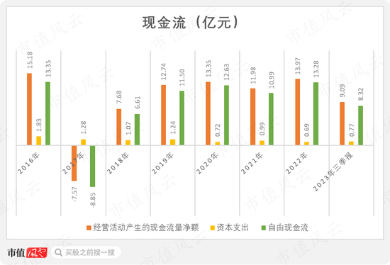 与此同时,2017年由于收到的保证金减少,经营活动现金流降幅较大。除此以外,其他年份经营活动产生的现金流量净额一直净流入,加上其资本支出金额一直不太大,因此自由现金流为正且金额较大,手头资金比较宽裕。