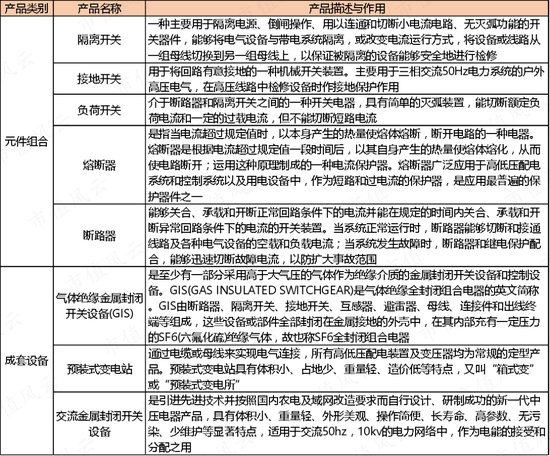 成套设备则是器件及其组合与其他电气设备(例如变压器、电容器、互感器、电抗器、避雷器等)在封闭外壳内进行合理配置和组合,具有相对完整使用功能的产品,例如金属封闭的高压开关柜、气体绝缘金属封闭开关设备(GIS)和高压/低压预装式变电站等。