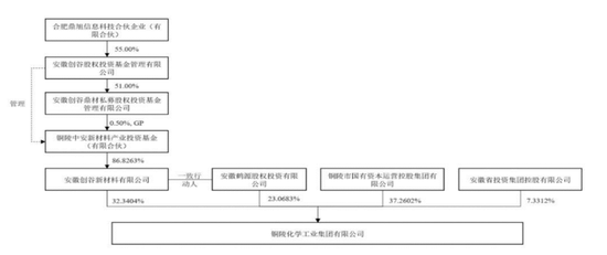 资料显示,铜化集团实控人原本为铜陵市国资委。在2019年,铜化集团因实施“国企混改”,引入投资方安徽创谷,安徽创谷凭借直接持有铜化集团32.34%的股权、与安徽鹤源之间签订的《一致行动协议》,合计控制铜化集团 55.41%的表决权比例,为铜化集团的控股股东。