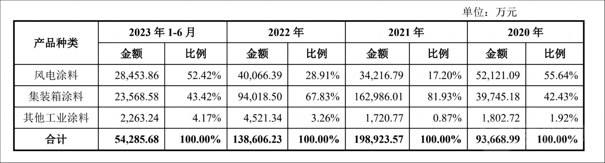 一方面是公司的经营情况。分业务来看,公司目前的营收来源主要包括风电涂料业务、集装箱涂料业务、其他工业涂料业务。2020年至2023年上半年,集装箱涂料销售收入分别为3.97亿元、16.30亿元、9.40亿元、2.36亿元,占主营业务收入的比例分别为42.43%、81.93%、67.83%、43.42%;风电涂料销售收入分别为5.21亿元、3.42亿元、4.01亿元、2.85亿元,占主营业务收入的比例分别为55.64%、17.2%、28.91%、52.42%。