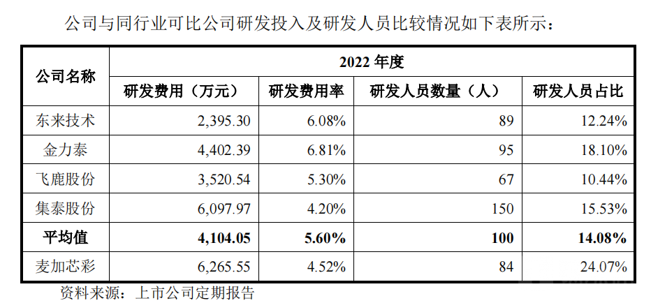 2022年,麦加芯彩的研发费用投入约6265.55万元,研发费用率为4.52%,同期集泰股份的研发费用约6097.97万元、金力泰(维权)的研发费用约4402.39万元、飞鹿股份的研发费用约3520.54万元、东来技术的研发费用约2395.30万元。
