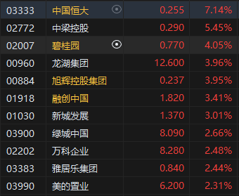 11月8日消息,内房股集体拉升,截止发稿,中国恒大涨超7%,中梁控股涨超5%,碧桂园涨超4%。
