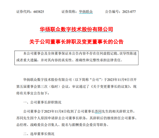 根据华扬联众同日公告,该公司董事会于11月8日收到了公司董事长苏同的相关辞职文件,苏同因个人原因申请辞去公司董事长职务,不过其辞职后,仍继续担任公司董事、总经理、战略委员会召集人、提名与薪酬委员会委员等职务。